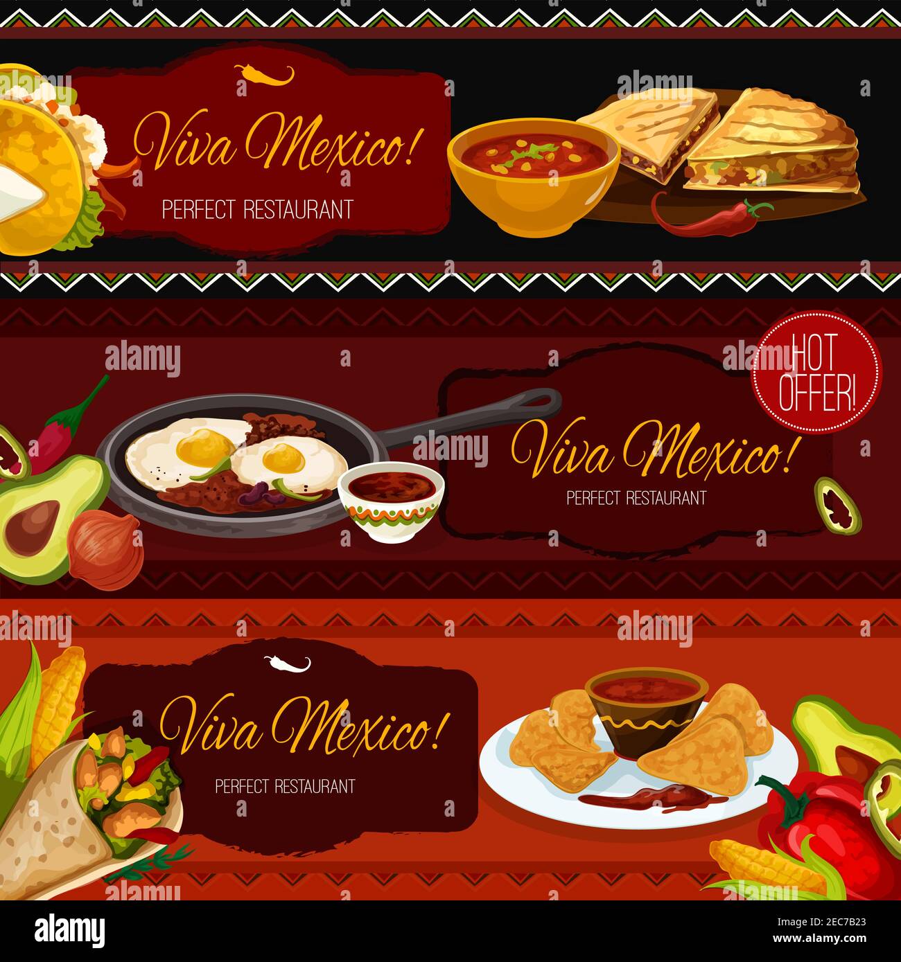 Mexican Cuisine Restaurant And Cafe Banners With Taco Nachos Burrito Beef Tapas Tomato Chilli Sauce Salsa Spicy Eggs With Beans And Guacamole Me Stock Vector Image Art Alamy